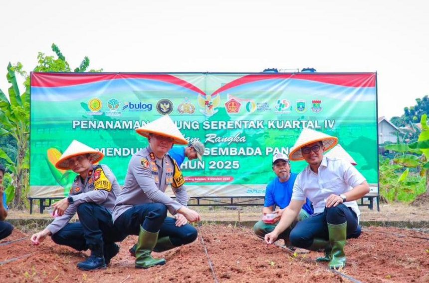 Wakil Wali Kota Tangerang Selatan (Tangsel) Pilar Saga Ichsan menghadiri kegiatan Tanam Jagung Serentak Kuartal 4 yang diselenggarakan oleh Polres Tangerang Selatan dalam rangka mendukung swasembada pangan yang diselenggarakan di Kawasan Pertanian Terpadu, Serpong, pada Rabu (08/10/2025).